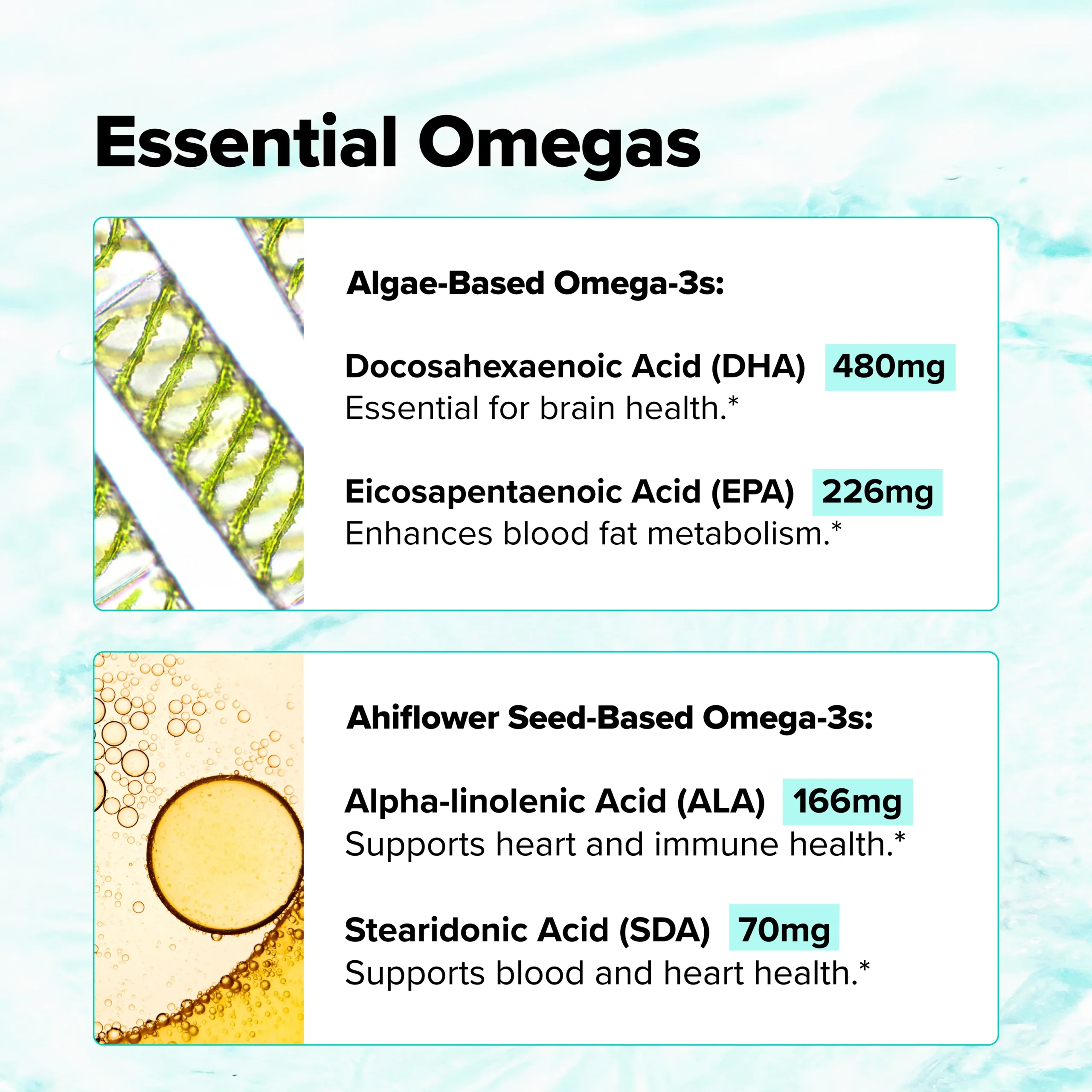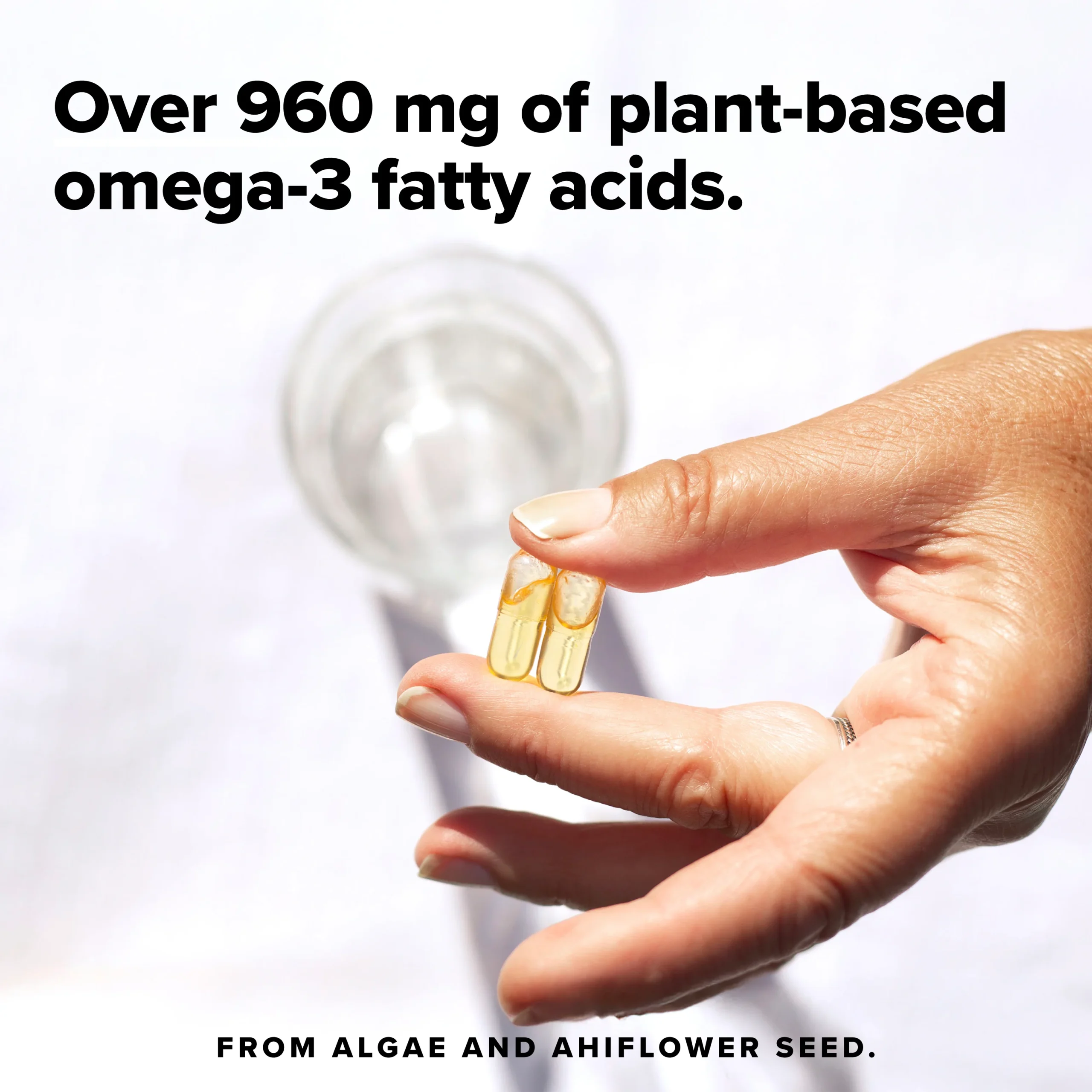 Powerful blend of plant-based DHA, EPA, ALA, and SDA omega-3 fatty acids. Over 960 mg of omega-3 fatty acids from algae and ahiflower seed to help support healthy brain function, nervous system regulation, and foundational long-term health.