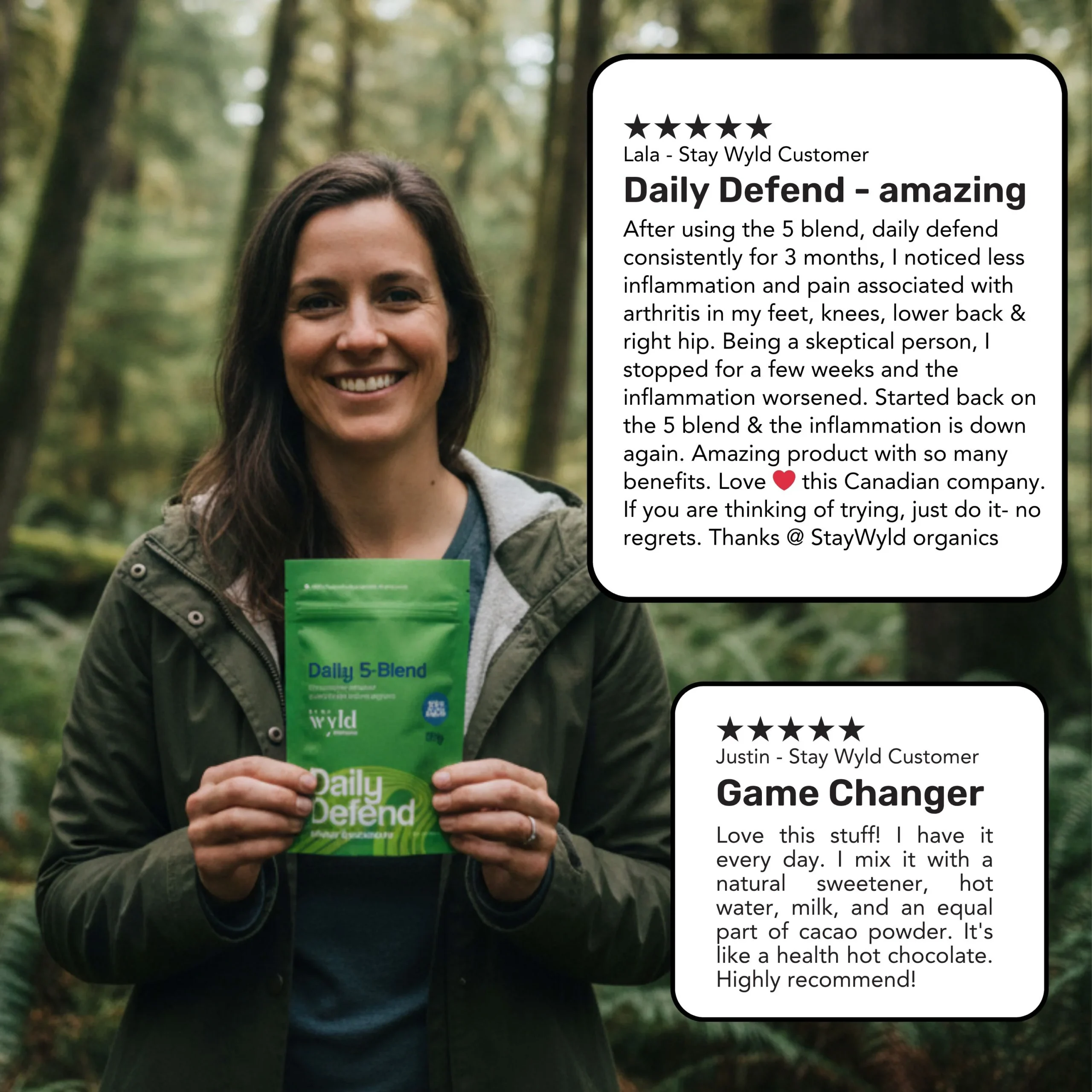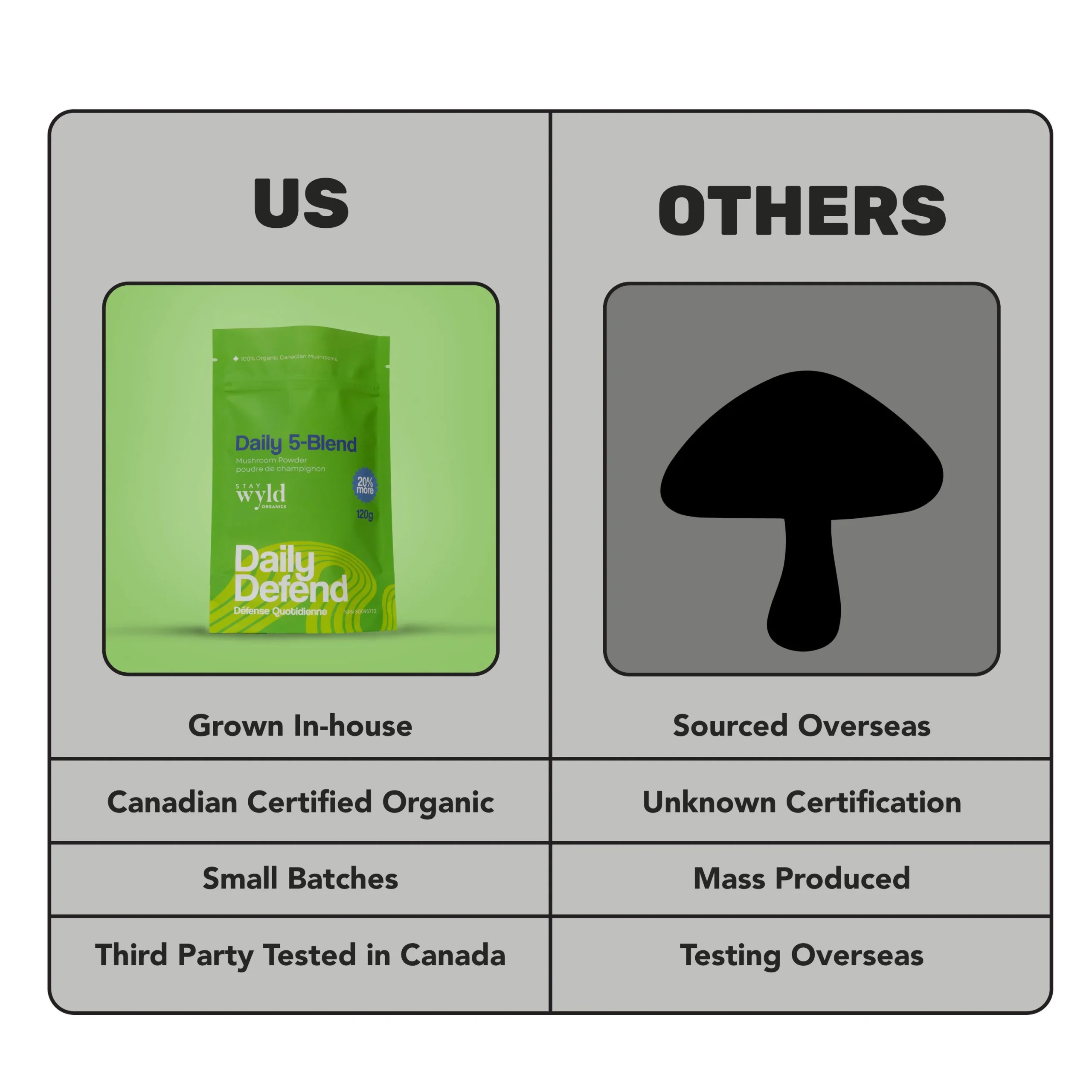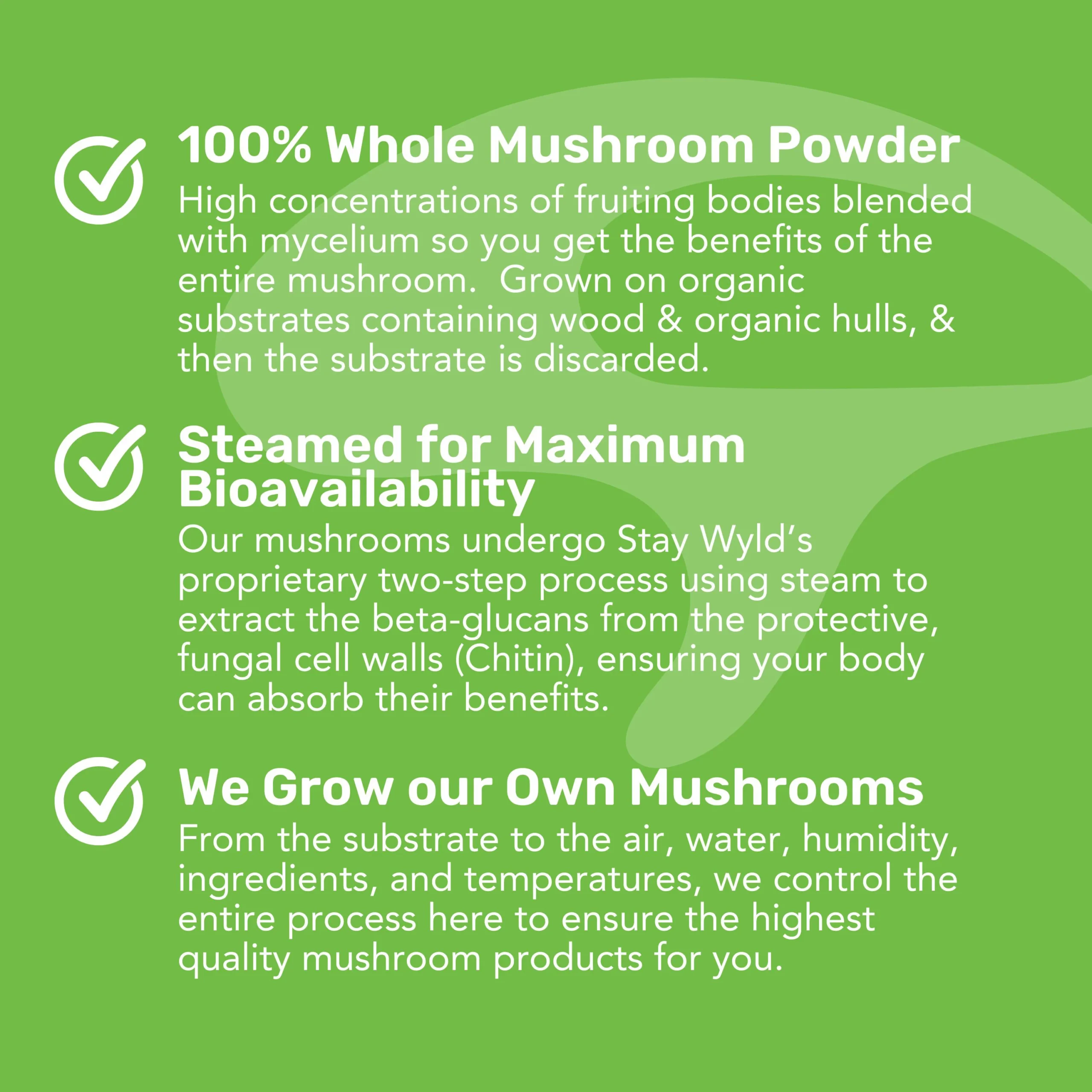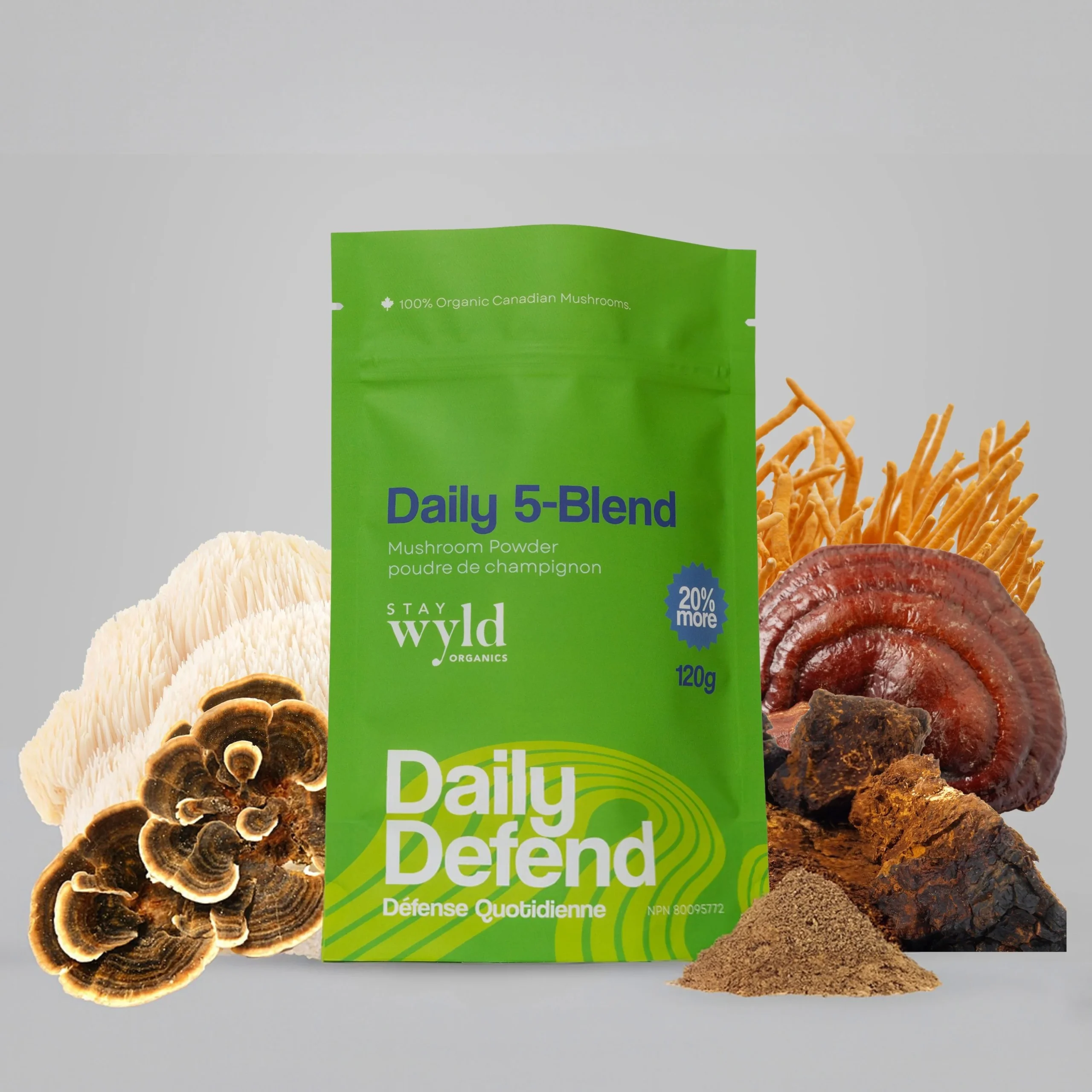 Ingredients: Sustainably Harvested Organic Wild Canadian Chaga (Inonotus obliquus), Organic Cordyceps Whole Mushroom Powder (Cordyceps militaris), Organic Lion’s Mane Whole Mushroom Powder (Hericium erinaceus), Organic Reishi Whole Mushroom Powder (Ganoderma lucidum), Organic Turkey Tail Whole Mushroom Powder (Trametes Versicolor)