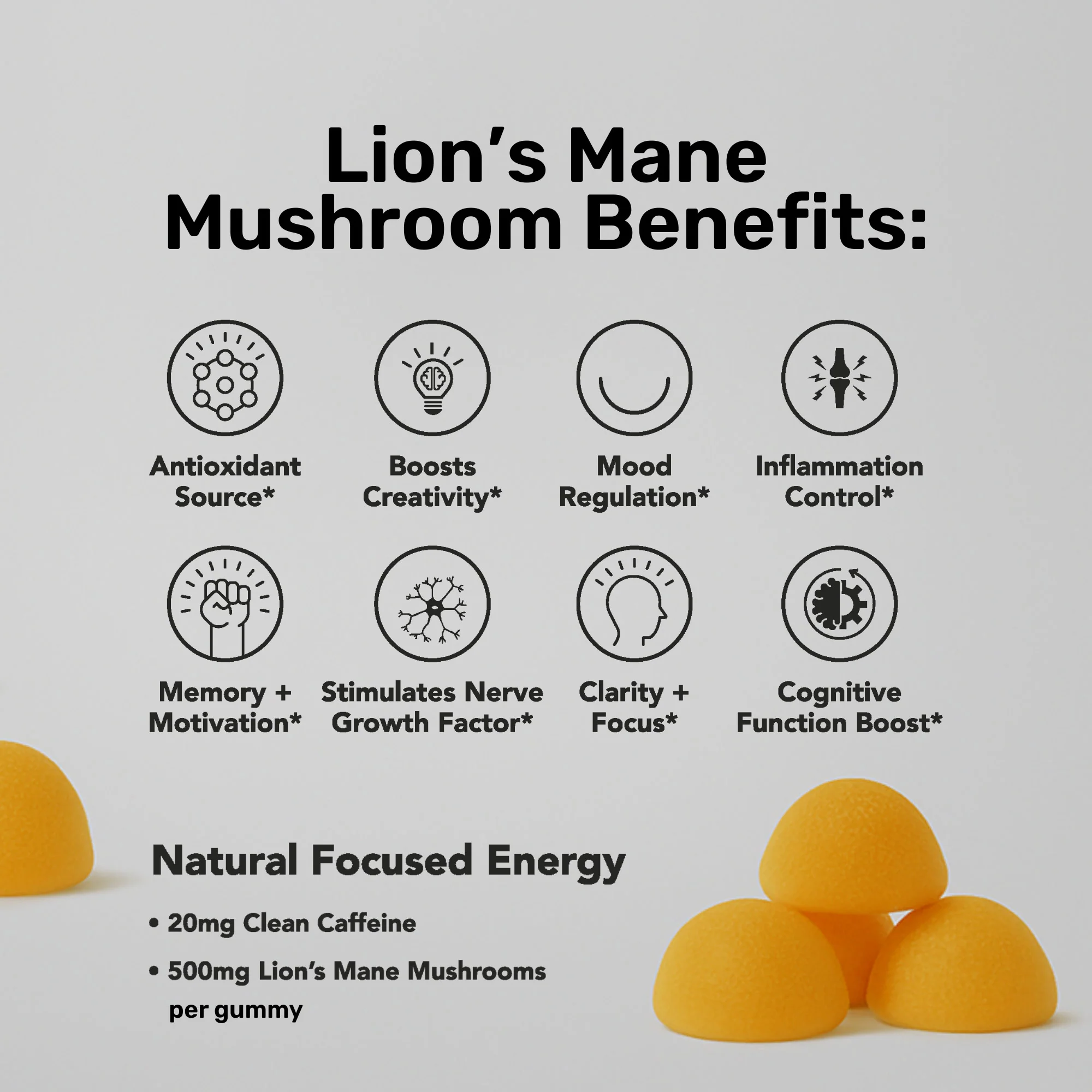 Focused Energy Gummies: 500 mg Lion’s Mane, 20 mg Natural Caffeine in each gummy.
