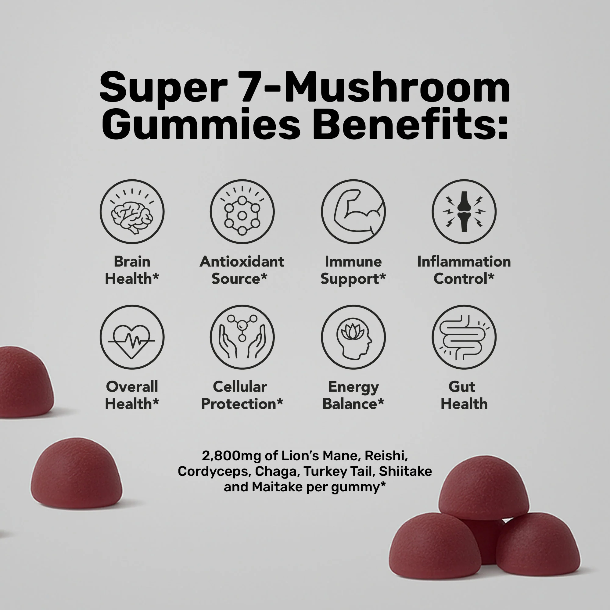 Super 7 Gummies: 2800mg of Pure Organic Lion’s mane mushroom, Pure Organic Reishi mushroom, Pure Organic Cordyceps mushroom, Pure Organic Turkey Tail mushroom, Pure Organic Shitake mushroom, Pure Organic Maitake mushroom in every gummy.